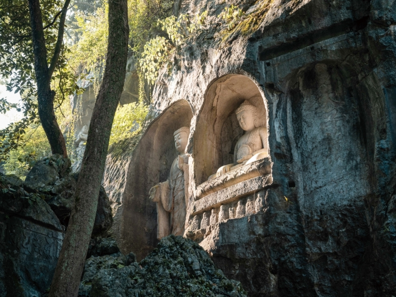 The Feilai Peak (or Peak Flown from Afar) was the third place that Wang had been to, which is one of the most popular tourist destinations in Hangzhou, with more than three hundred exquisitely carved Buddhist statues hidden in the caves of the walls of the cliff. Also known as Lingjiu Peak, the Feilei Peak can be seen right in front of Hangzhou's Lingyin Temple. Legend has it that over 1,600 years ago, when an Indian monk by the name of Huili arrived, he was quite surprised to see a peak towering above the nearby valley and high in the sky. He wondered aloud "how has such a peak flown all the way from India to this place?" Hence the name of the peak.