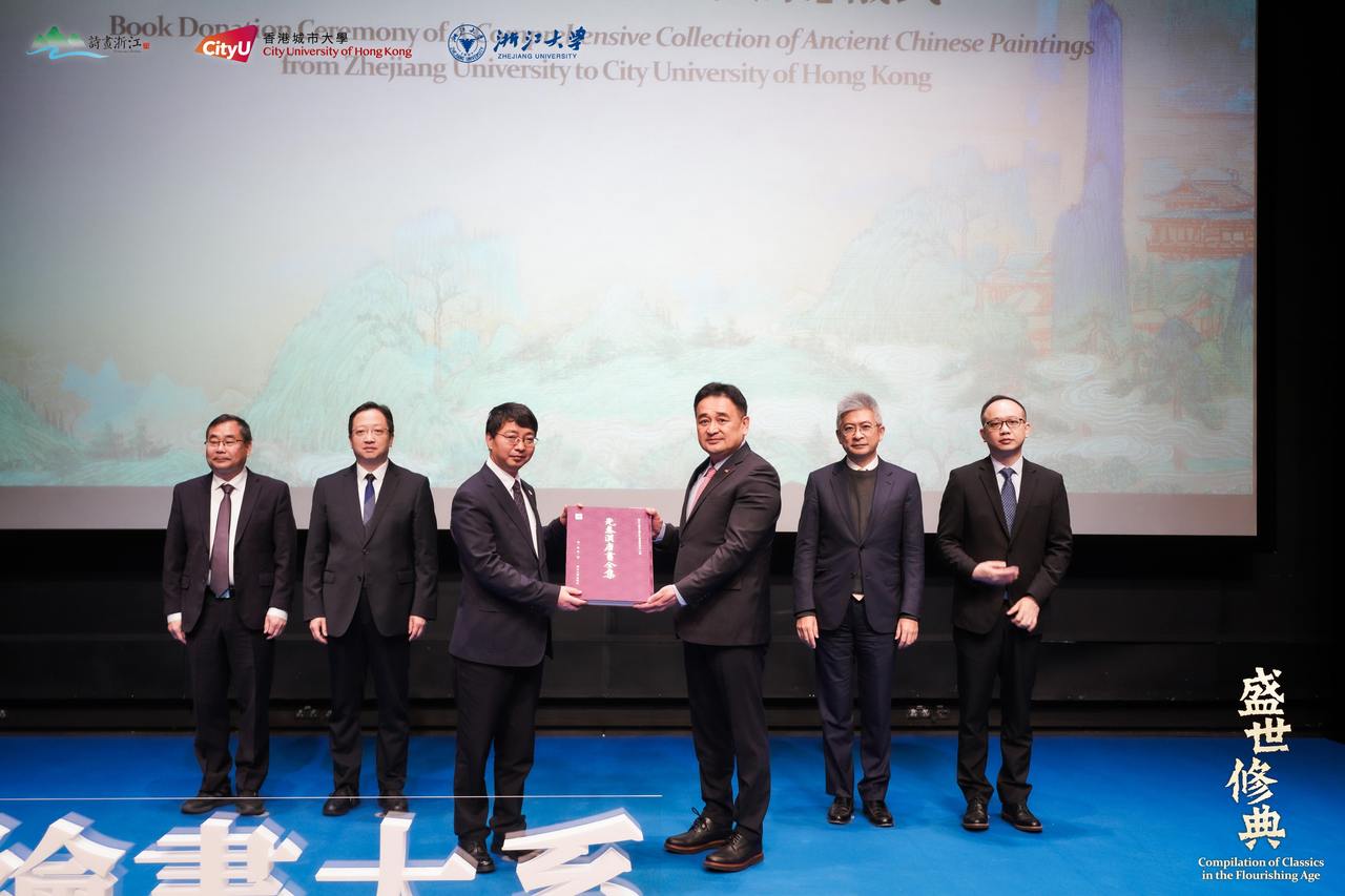 1月30日上午,浙江大学向香港城市大学赠送“中国历代绘画大系”仪式暨专题学术交流活动在香港城市大学邵逸夫创意媒体中心举行。香港中联办宣文部副部长林枬,浙江省委宣传部副部长、省政府新闻办主任虞汉胤,浙江省文化广电和旅游厅党组成员、副厅长张广洲,香港特别行政区政府文化体育及旅游局副局长刘震,浙江大学副校长周江洪,香港城市大学副校长(人才及国际战略)李文荣,香港城市大学协理副校长(环球战略)林芬等百余位嘉宾出席活动。