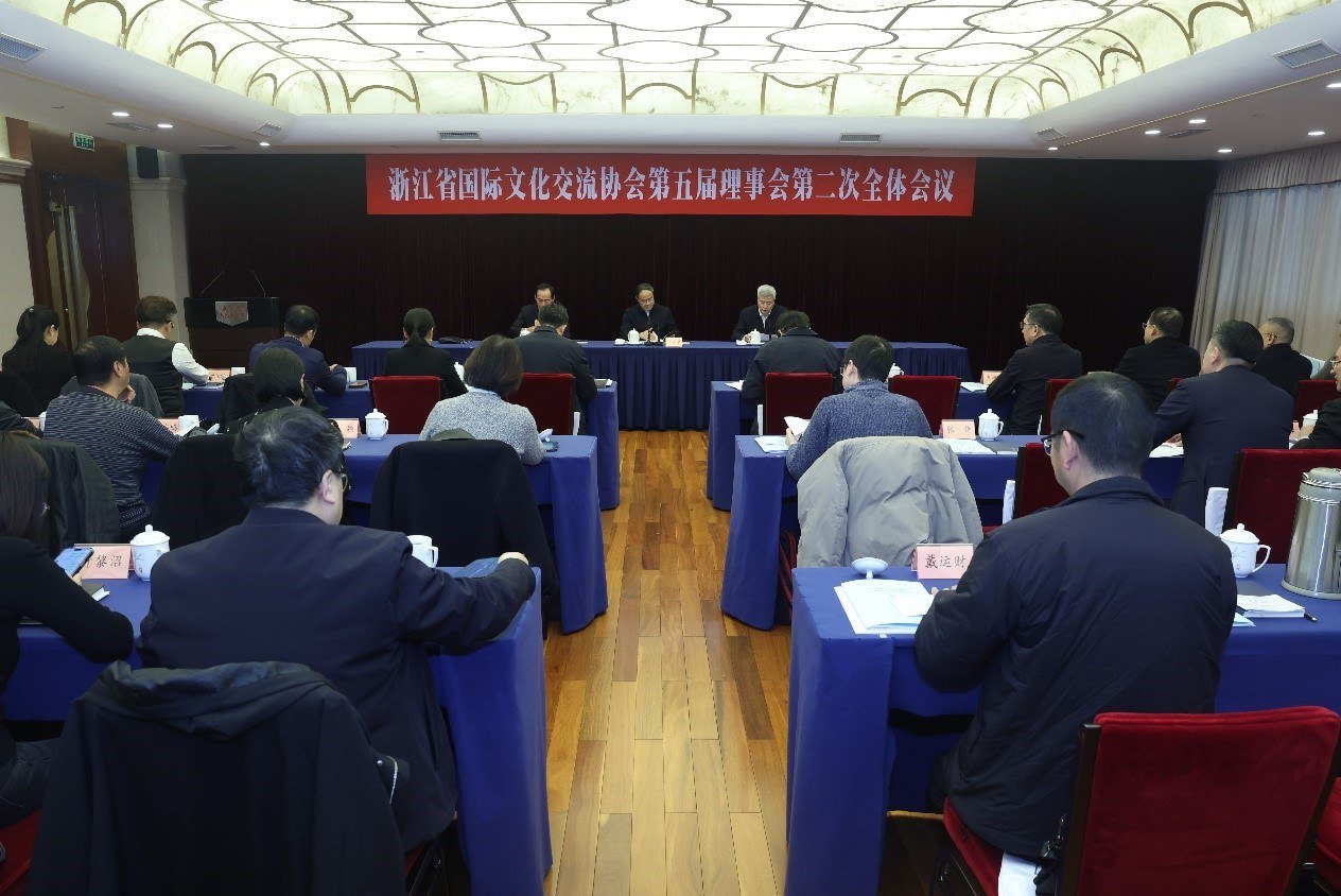 2026年2月5日,浙江省国际文化交流协会第五届理事会第二次全体会议在杭州召开。会议深入学习党的二十届四中全会精神、习近平外交思想、习近平文化思想,全面总结协会2025年工作,系统研究部署2026年重点任务。理事长王昌荣出席会议并讲话,副理事长姜军主持会议。全体理事及会员代表参加会议。